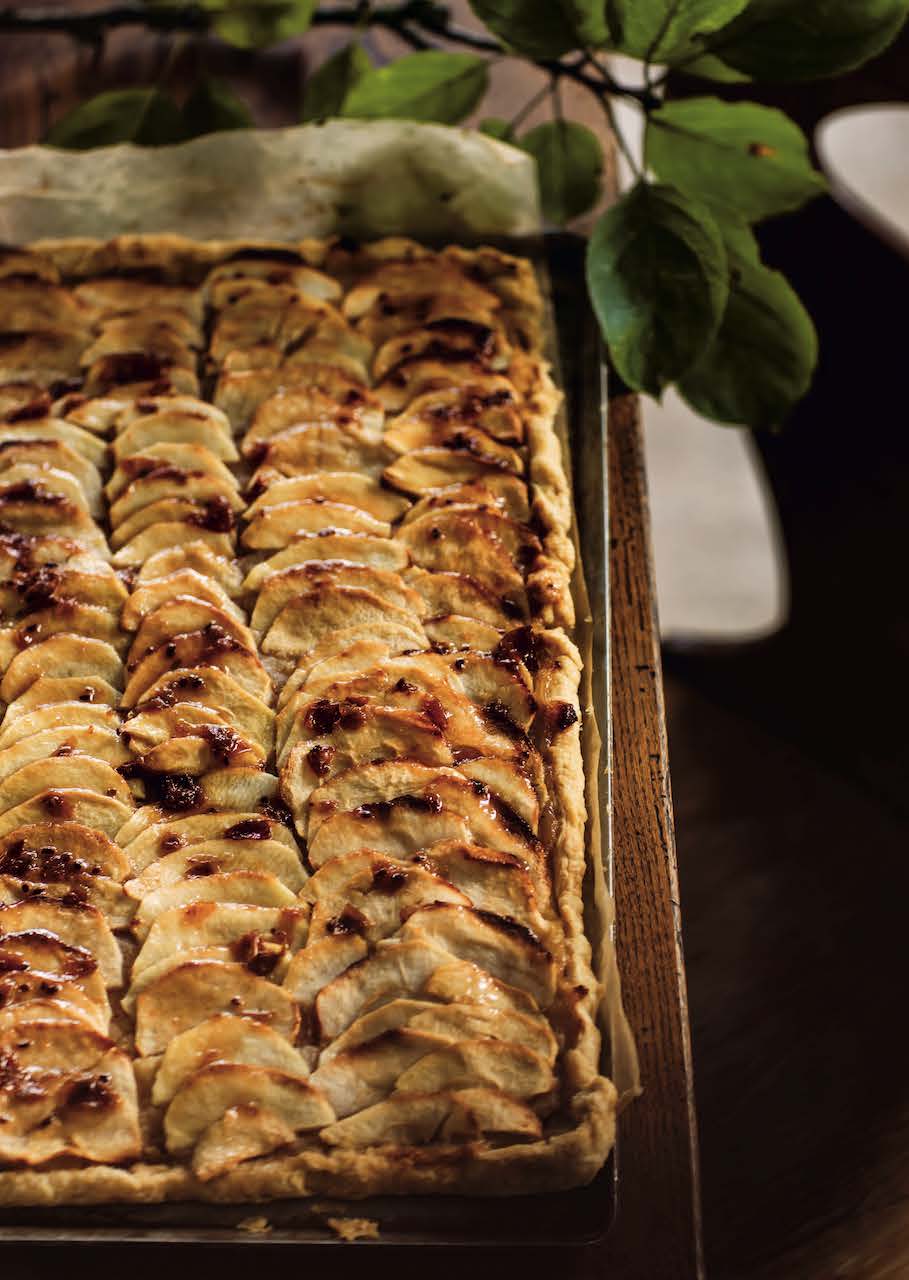 beurre clarifié jusqu’à les dorer un peu et on ajoute du sucre pour les caraméliser. On les dispose dans le fond de pâte, il faut une couche un peu épaisse, on passe au four 20 minutes avant de bien tasser. Là-dessus, on tartine une crème d’amandes faite avec 60 g de beurre mou, 50 g de sucre, 60 g d’amandes torréfiées et moulues au robot avec unpeudesucre,1c.às.decrèmeet un trait d’alcool (du rhum, du whisky, de l’absinthe…). On repasse au four environ 15 minutes jusqu’à ce que cette croûte soit bien dorée. C’est la tarte aux pommes qu’on apporte pour les goûters du dimanche.