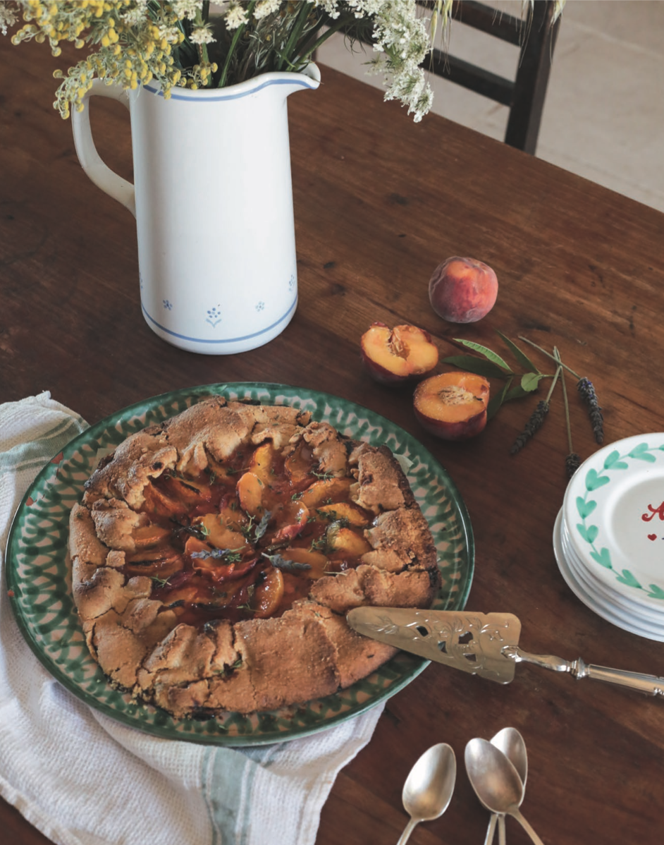 Préchauffez le four à 180 °C (th. 6). Abaissez la pâte sur une feuille de papier cuisson et déposez votre compotée d’abricots au centre avant de recouvrir de tranches de pêche. Rabattez les bords sur les fruits, comme sur la photo. Enfournez pendant environ 20 min, jusqu’à ce que les bords de la pâte soient joliment dorés. À la sortie du four, vous pouvez décorer de quelques feuilles de verveine.