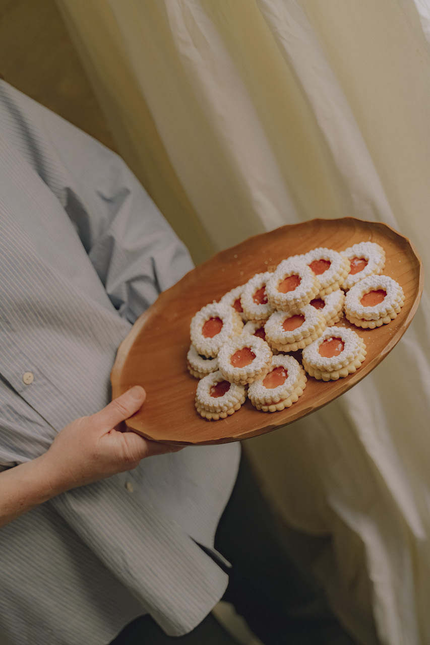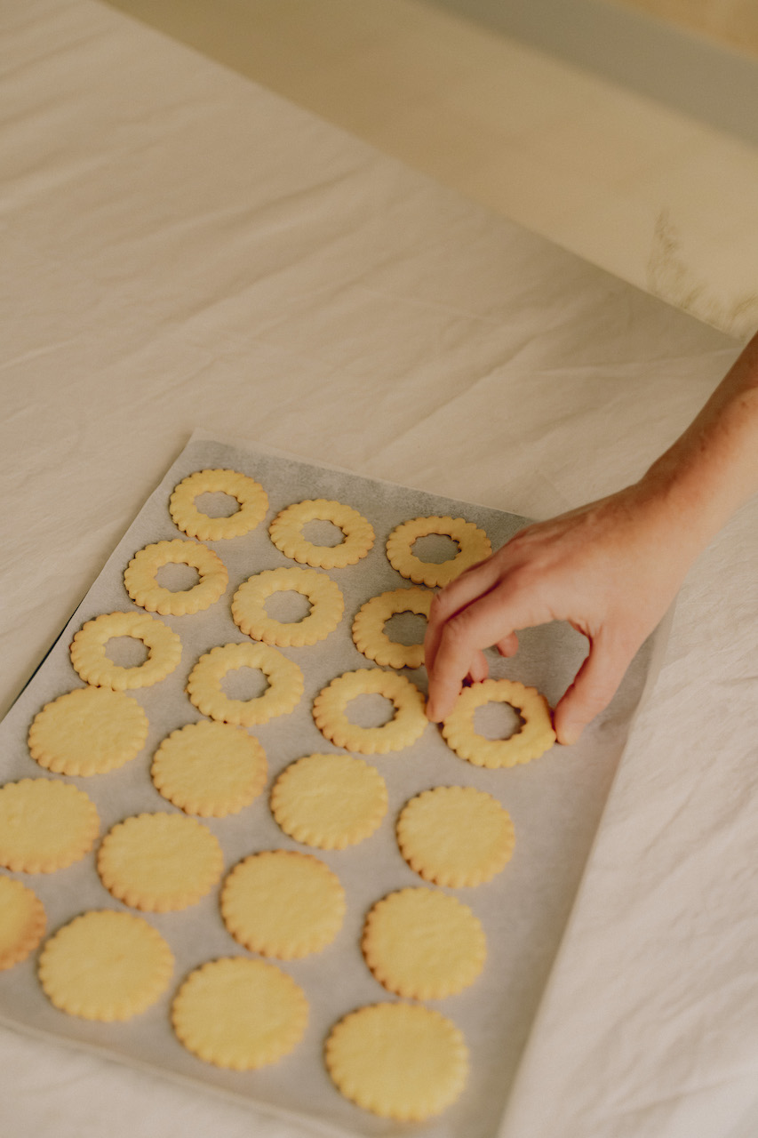 Étalez la pâte sur une épaisseur de 3 mm en utilisant des règles de pâtisserie. Découpez selon la forme désirée et disposez les pièces sur une plaque recouverte de papier cuisson. Sur la moitié des biscuits, découpez un trou à l’aide d’un emporte-pièce plus petit que celui utilisé précédemment. Placez la plaque au frais pendant 30 min. Préchauffez le four à 200 °C (th. 6/7) et cuisez les biscuits pendant 7 min. Saupoudrez ensuite les couvercles de sucre glace. Étalez 1 c. à c. de confiture de votre choix (ici de coings, cf. recette ci-dessous) sur chaque biscuit, posez le couvercle correspondant et laissez sécher avant dégustation.