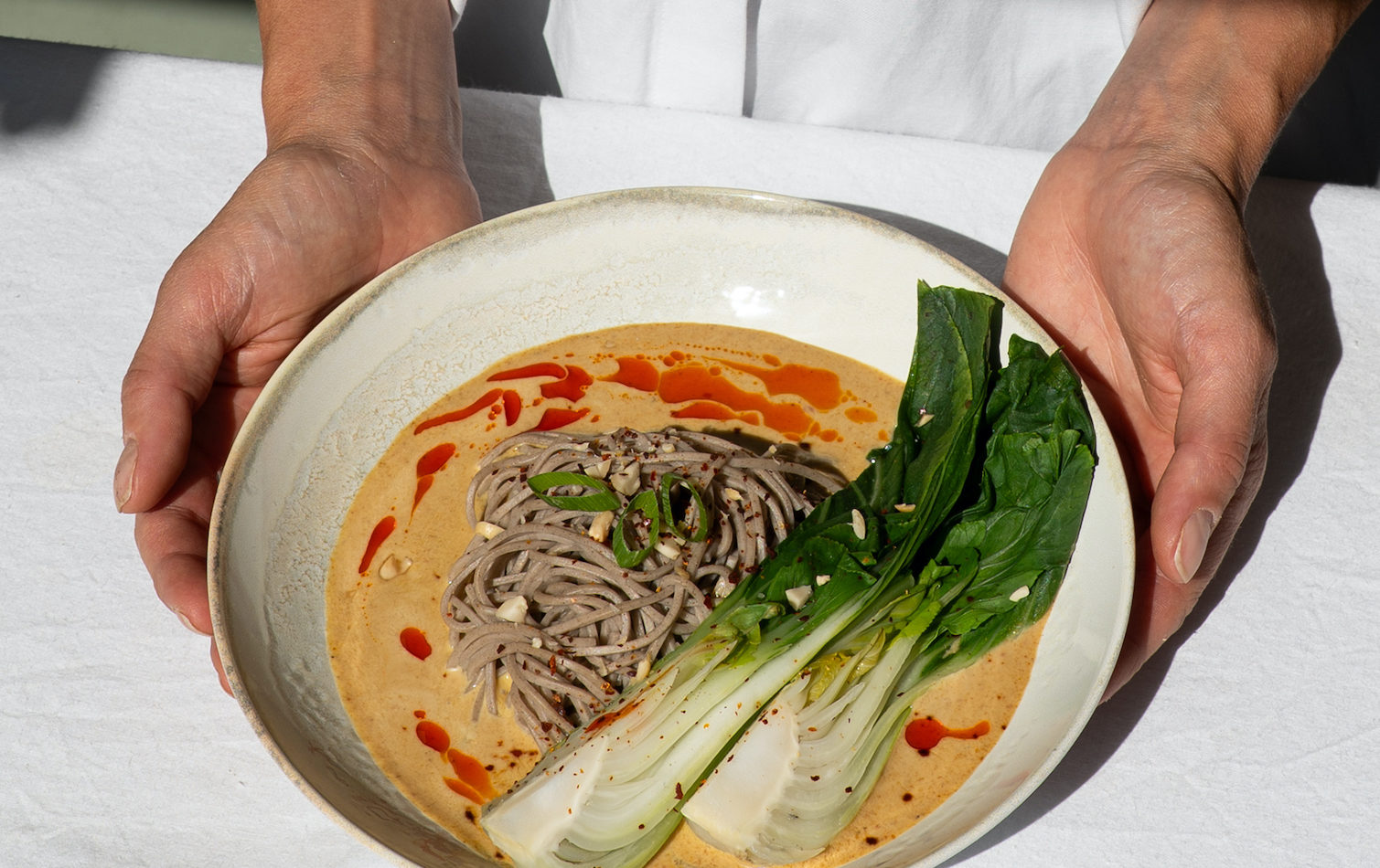 Dressez. Dans chaque bol, déposez un nœud de nouilles soba, versez la soupe chaude ou froide et ajoutez les morceaux de pak-choï. Parsemez d’éclats de cacahuète. Terminez avec un filet d’huile pimentée et quelques herbes fraîches si désiré.