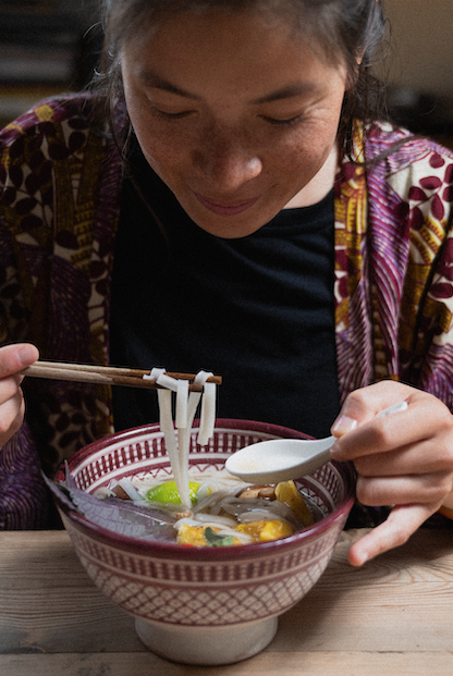 Préparez la garniture des bols. Faites revenir à la poêle le reste des champi- gnons shiitaké coupés en 2 dans l’huile pendant 5 minutes. Salez et poivrez à votre goût. Faites cuire les nouilles de riz selon les instructions du paquet. Égouttez et rincez à l’eau froide pour éviter qu’elles ne collent. Émincez l’oignon.