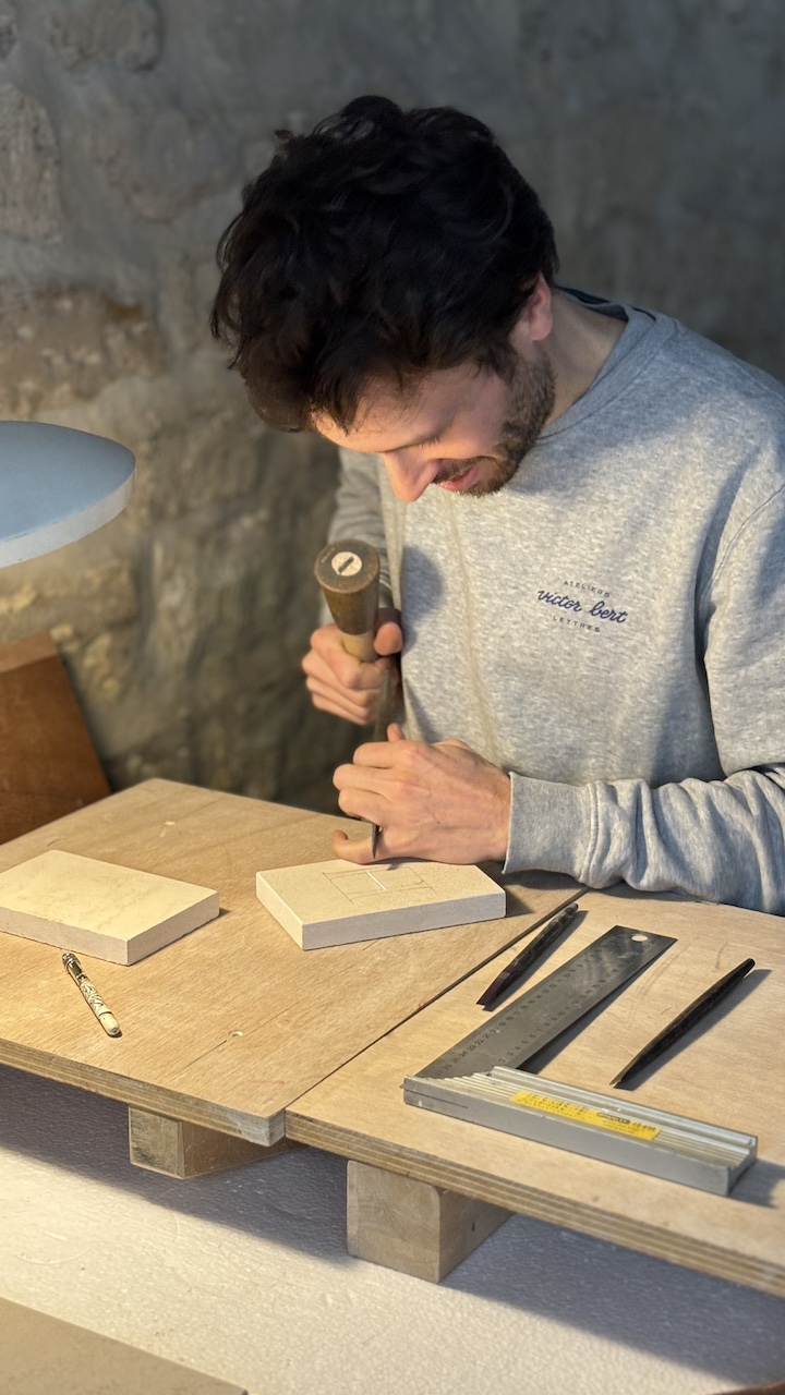 Mes parents m’ont très tôt emmené visiter des monuments historiques – c’est sans doute là que tout a commencé. J’ai rapidement compris que je travaillerais avec mes mains. Mon parcours initial était la taille de pierre, avec l’ambition d’œuvrer dans les monuments historiques. C’est au cours de cette formation que j’ai découvert la gravure sur pierre, et avec elle tout un univers : la calligraphie, le dessin de lettres. Ce fut une révélation ! De fil en aiguille, la lettre s’est déclinée sur d’autres supports : la peinture en lettres, la dorure, la gravure …